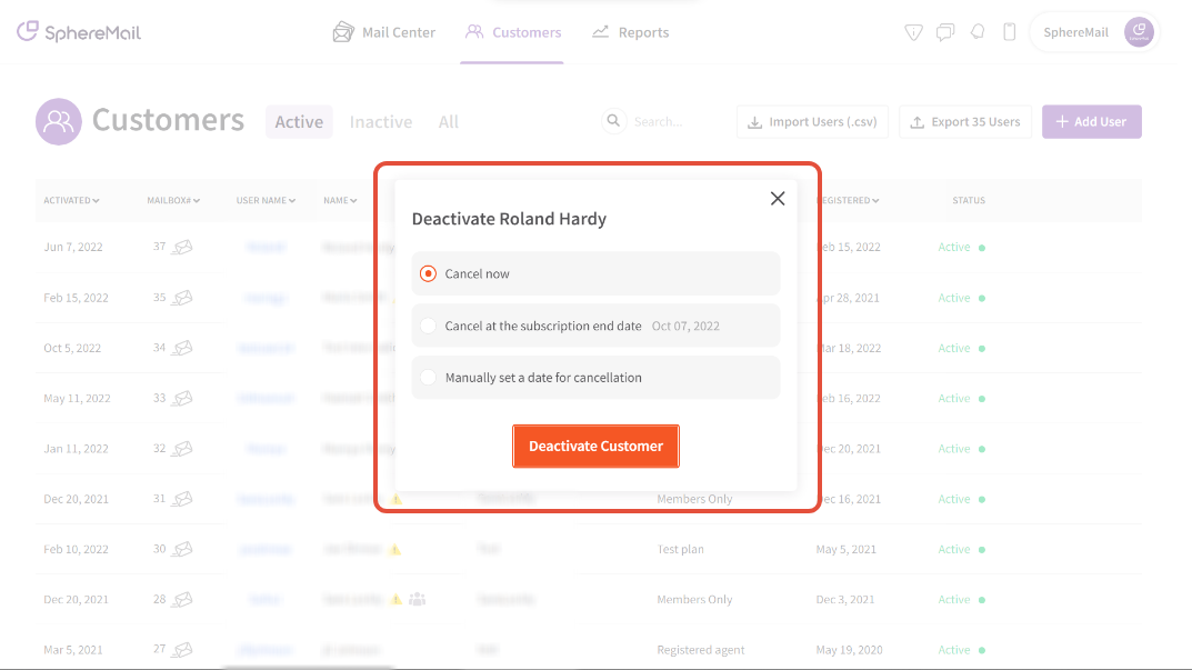 - Click "Deactivate Customer" to confirm deactivating the customer's account
